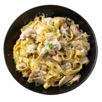Fettuccine, Alfredo Sauce, Lemon, Fresh Basil, Shaved Grana Padana, Served with Garlic Bread