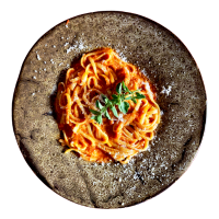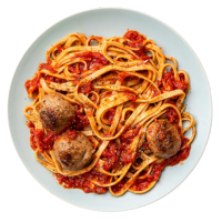 Forno Cooked Meatball, Marinara Sauce, Linguine, Shaved Grana Padana, Fresh Basil, Served with Garlic Bread