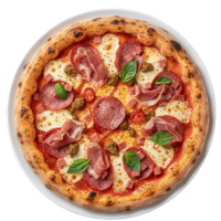 Rossa Sauce, Mozzarella, Ham Calabrese, Italian Sausage, Prosciutto, Basil