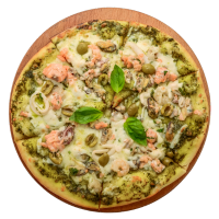 Pesto Sauce, Mozzarella, Prawns, Red Onion. Roasted Garlic, Grana Padano, Parsley, Lemon