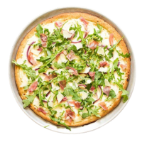Bianca Sauce, Mozzarella, Prosciutto, Fresh Arugula, Cherry Tomato, Balsamic Glaze, Grana Padano, Lemon